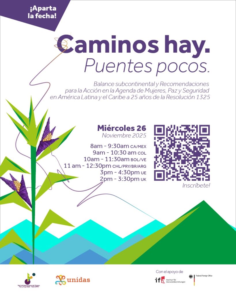 This webinar presents the report “Caminos hay, puentes pocos”, a critical and forward-looking analysis of the Women, Peace and Security Agenda in Latin America and the Caribbean, 25 years after UN Security Council Resolution 1325. The document brings together experiences, lessons learned and recommendations from a vast network of feminist organisations across the region, and is designed as a political and technical tool to guide action, advocacy and international cooperation in the years ahead.