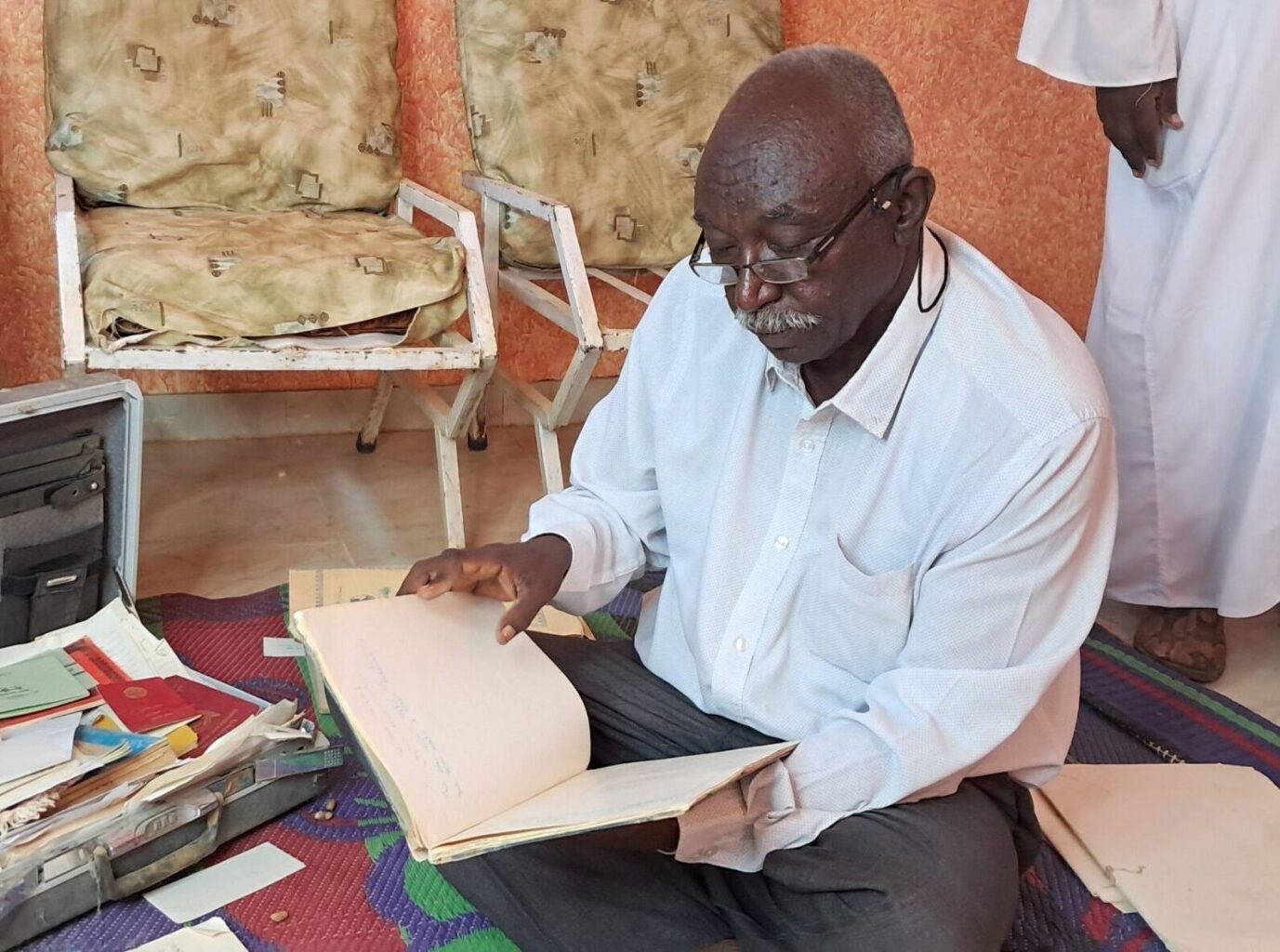 Home revisant documents d’arxiu a mà, envoltat de carpetes i papers, durant el procés de digitalització de materials històrics. Autoria: Wahbi Abdalrahman (Sudan Memory).